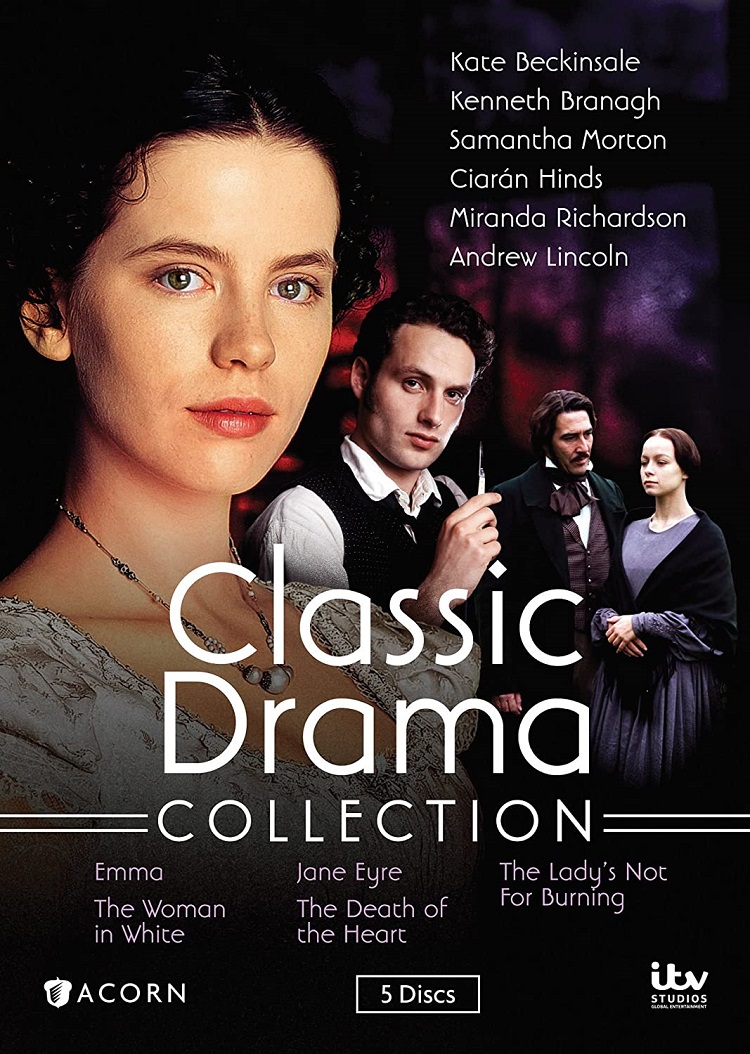 Acorn Media has managed to put together a package of five films that are really rather good, and well worth the buy. These things are always grouped around a person or a theme. An actor, maybe, or a director. Or more likely it’s a group of horror movies, or perhaps films that all take place on a tropical island. This set, as might be obvious from the name, collects films that are based on classic dramatic literature or plays. The films included are Jane Austen’s Emma, Charlotte Bronte’s Jane Eyre, The Woman in White, The Lady’s Not for Burning, and The Death of the Heart.